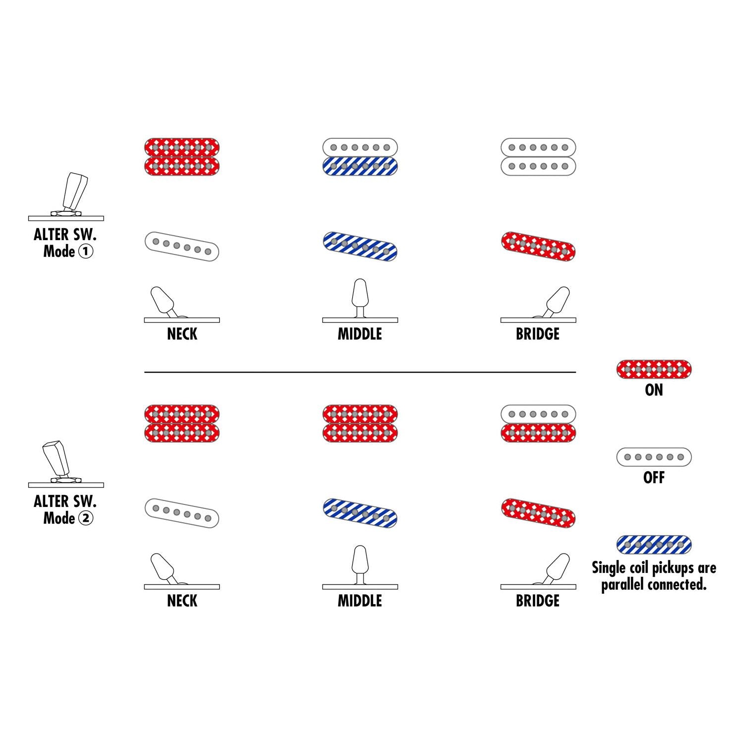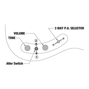 dyna-MIX5 switching system med Alter Switch ger tillgång till många användbara ljud som man normalt inte förknippar med en T-style gitarr. Men självklart är alla de ljud man förväntar sig också där. Men Alter switch av (nere) har man de länge man förväntar sig på 3-läges switchen.