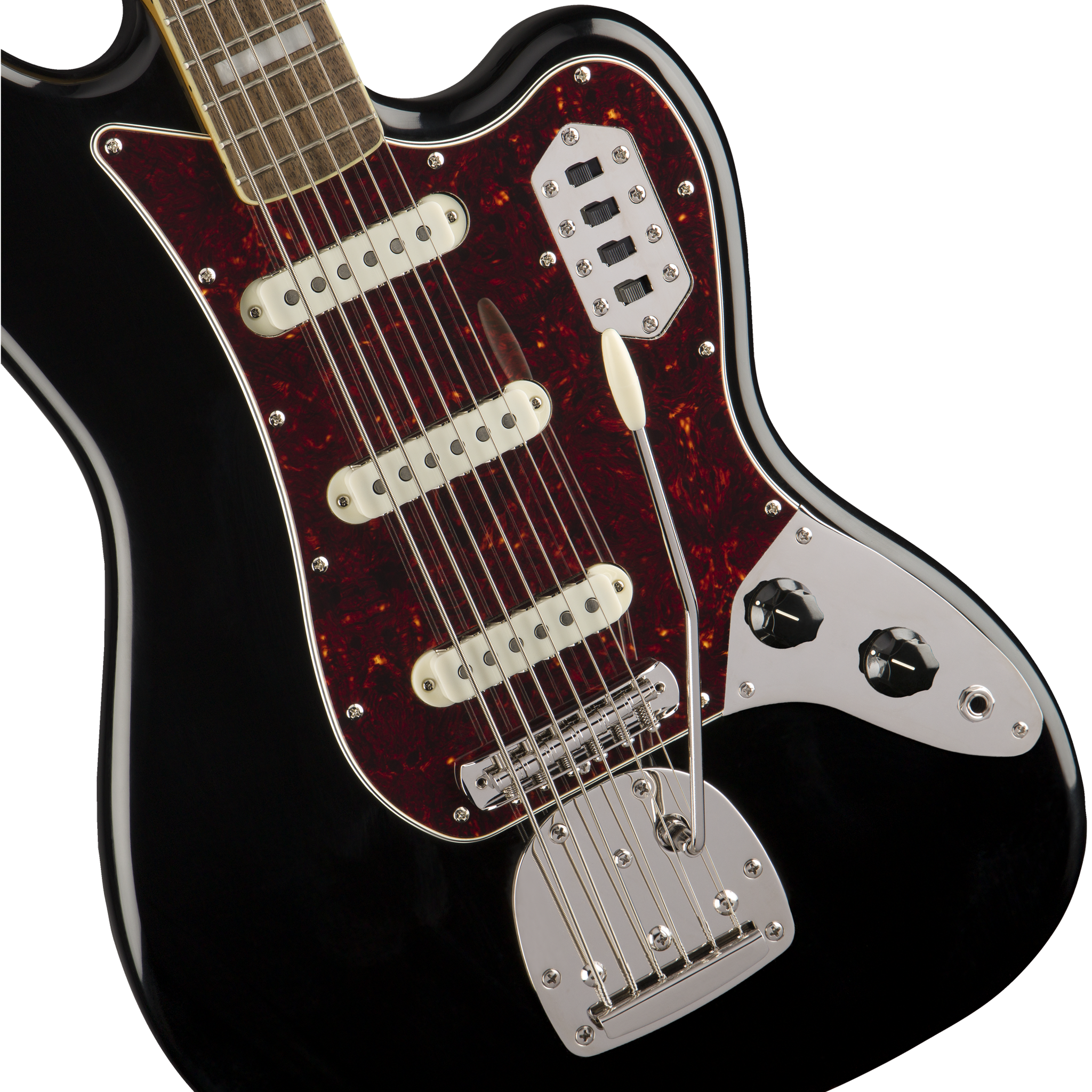 Bass VI har en smal, bekväm "C"-formad halsprofil med en lättspelad 9.5"-radie greppbräda och smala band, samt en flytande stall med fat-sadlar för stabil strängstabilitet. Denna retro Squier-modell har också 1960-talsinspirerade headstocksmarkeringar, snyggt nickelpläterat hardware och en slät vintage-tintad hals för en old-school vibe.