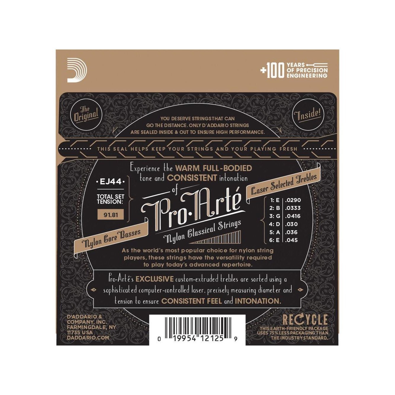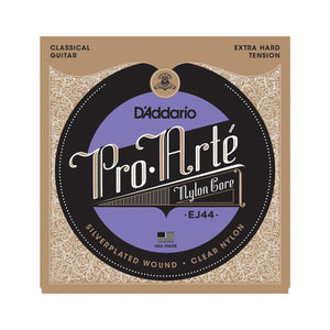 EJ44, Extra Hard Tension. Pro Arté är D'Addarios mest säljande sträng för klassisk gitarr. Uppskattad för sin perfekta balans av ton, spelkänsla och dynamik. Flera års lång utveckling ledde fram till Pro Arte serien där varje strängs diameter kontrolleras 200 gånger med hjälp av ett sofistikerat databaserat lasersystem. Denna extremt nogranna kvalitetskontroll garanterar en absolut jämn och hög standard på strängarna från set till set. Bassträngarna är precisionsspunna med en silverpläterad koppartråd över en nylonkärna vilket ger strängen dess varma och tydliga ton. Enligt många koncertgitarrister det bästa strängset som någonsin skapats, och rekommenderas varmt av de flesta gitarrlärare.