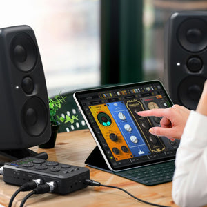 Var alltid redo! Har du någonsin saknat en viktig kabel eller anslutning mitt i sessionen? Eller oroar du dig före, under eller till och med efter en inspelning att ditt arbete kan äventyras av tekniska problem? iRig Pro Quattro I/O kommer att lösa dessa problem för alltid. Det är ett portabelt 4-in/2-out portabelt ljud- och MIDI-gränssnitt av professionell kvalitet.