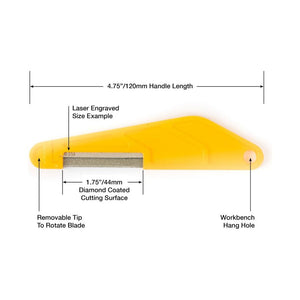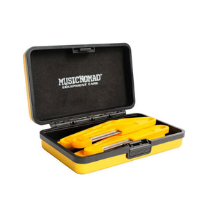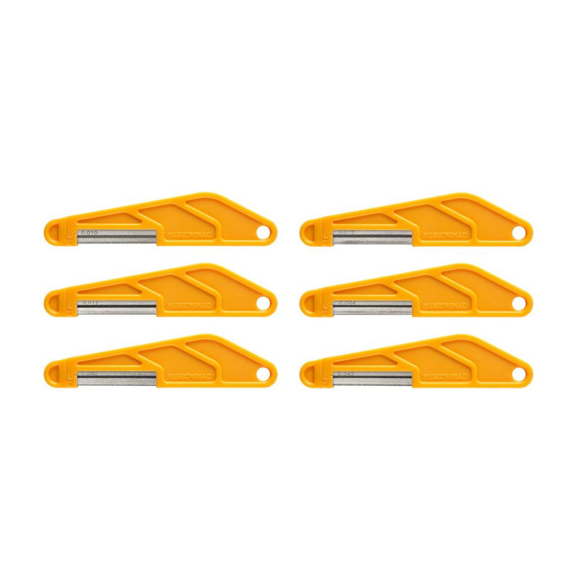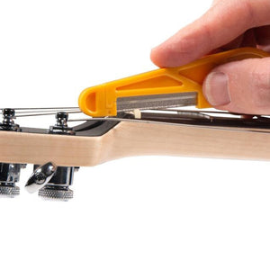 MusicNomad's Diamond Coated Nut File fungerar lika bra på sadlar i ben, grafit, plast eller TUSQ som i metall. Den unika utformningen gör att filbladet inte böjer sig vid användning vilket ger ett exakt och perfekt resultat. Beläggningen både filar och polerar på samma gång så ingen efterputsning behövs för att få en perfekt yta för strängen att vila mot. För att du tydligt ska ha koll på dina filar är storleken lasergraverad på filbladet och det ergonomiska handtaget i plast har ett hål för upphängning så du kan ha tydlig ordning och reda på dina verktyg. Med en längd på 120mm är den lagom stor för att vara lättgreppad men ändå smidig nog för att inte ta för stor plats på din arbetsbänk.