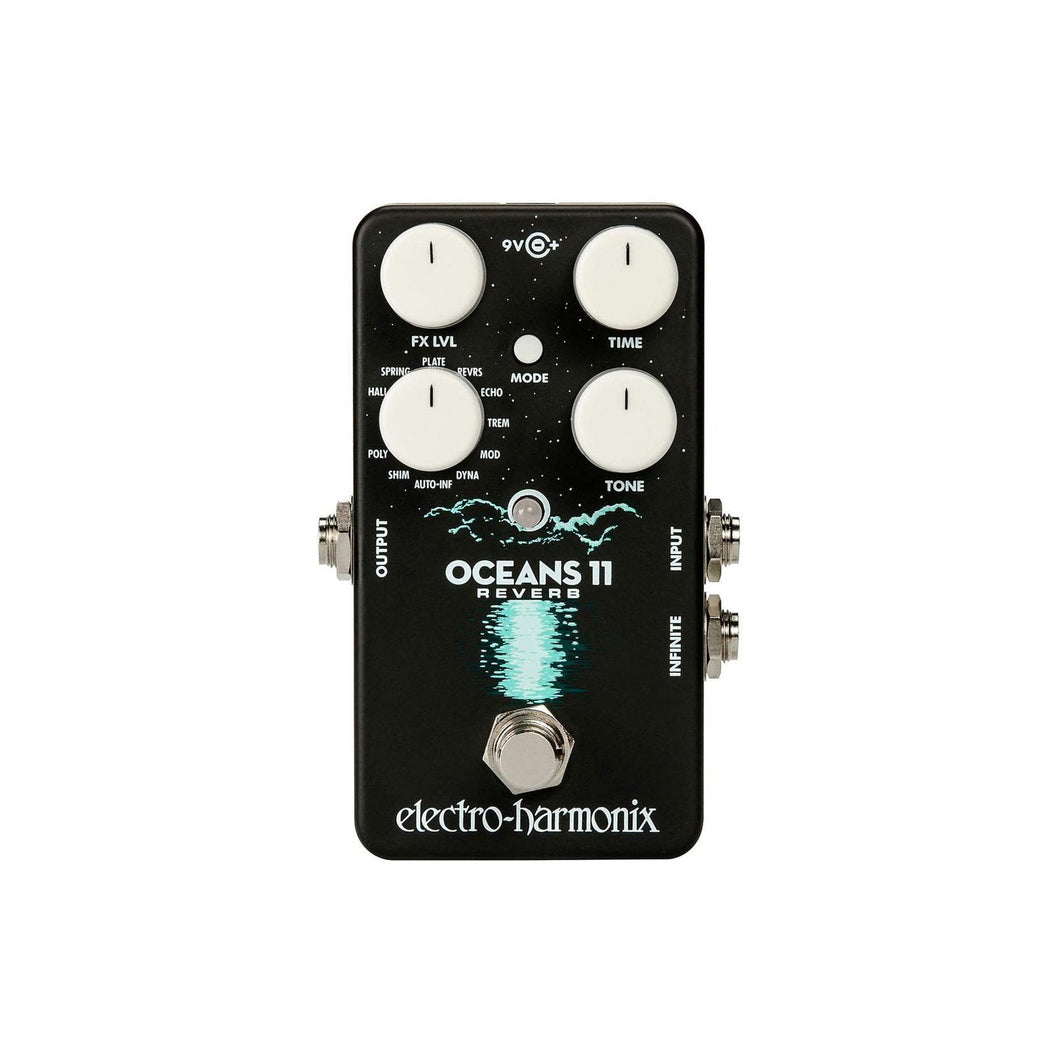 Oceans 11 Reverb bjuder på elva väldigt varierade reverbstilar. Välj mellan HALL, SPRING, PLATE, REVRS, ECHO, TREM, MOD, DYNA, AUTO INF, SHIM, PLOY för att komma igång. Som om dessa lägen inte varit nog, har Electro-Harmonix Oceans 11 även ett läge två där du hittar mer och kan finlira ytterligare. Välj om du vill ha fade eller bryta effekten, du kan också välja infinite-läge för att behålla vissa sound och addera en till effekt. Läs mer om de 11 effekterna nedan och lyssna gärna in Electro-Harmonix demo-video.