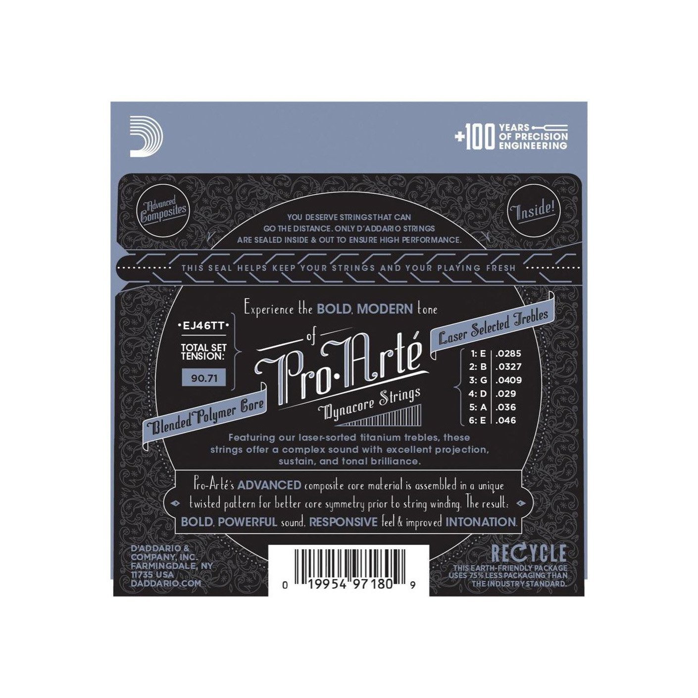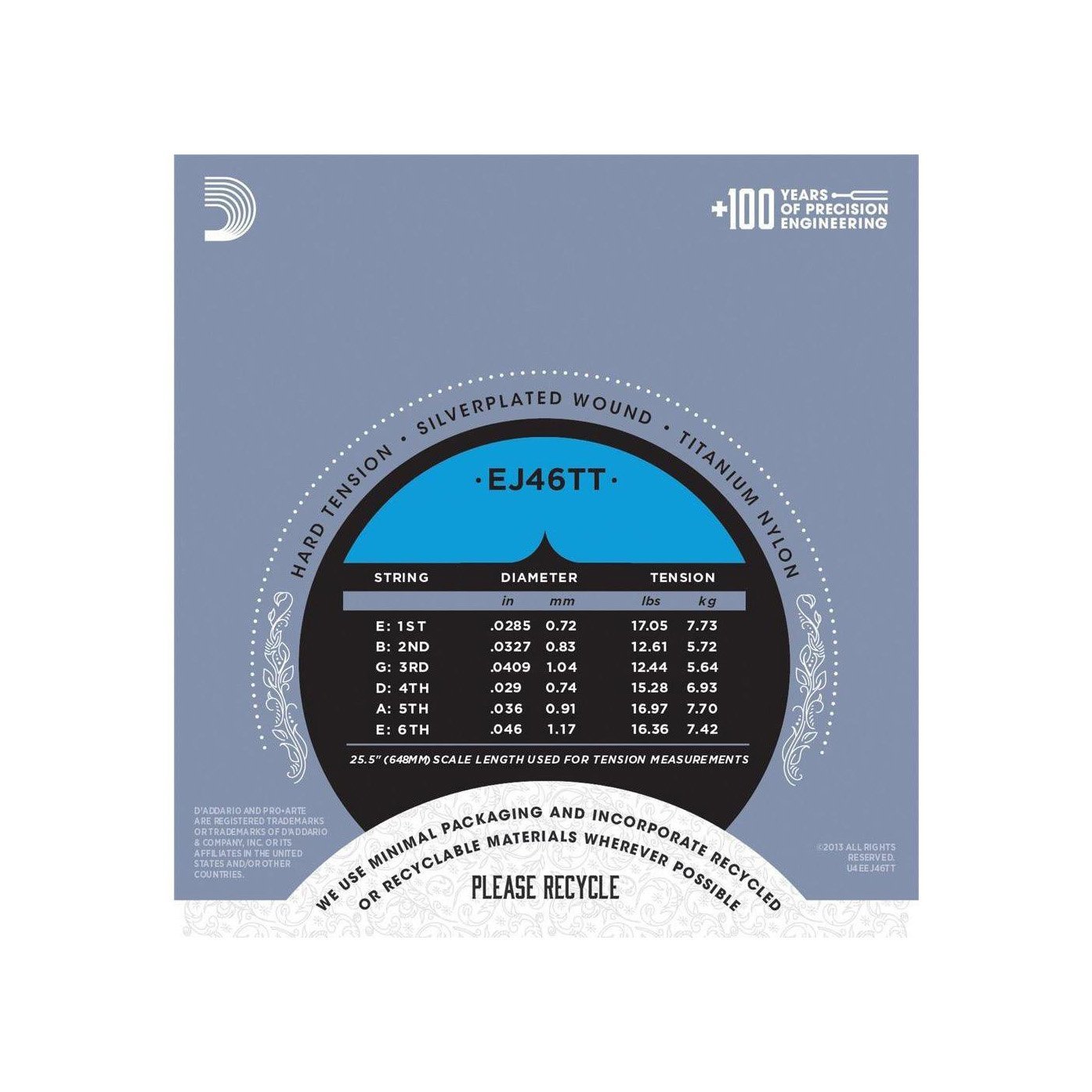 EJ46TT, Hard Tension. D'Addario Dynacore är för klassisk gitarr och med en flexibel kompositkärna som ger en krafull och fyllig ton. Diskantsträngarna är tillverkade av titaniummaterial för klarhet och tonal balans.