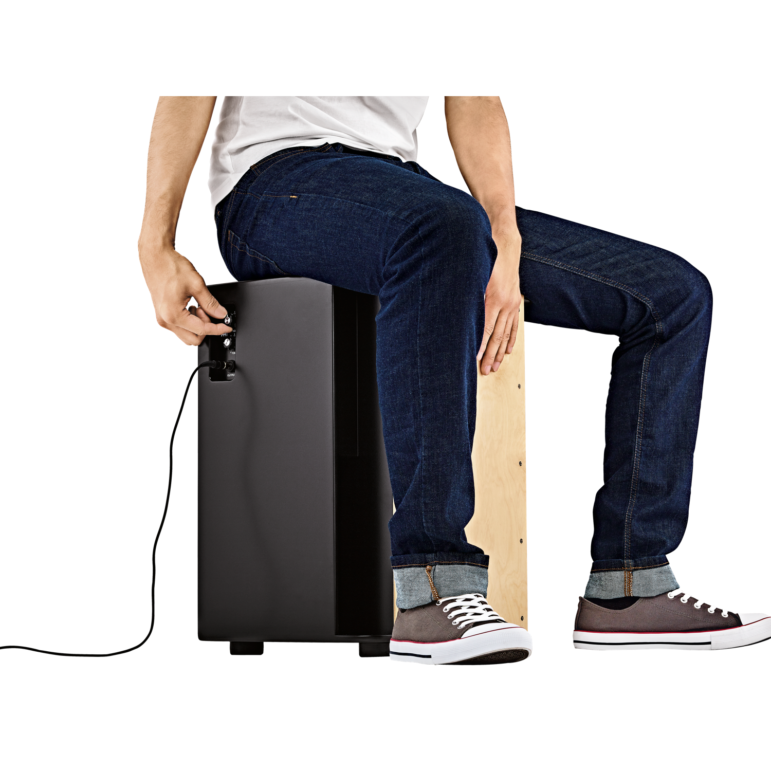 Subwoofer Pickup Cajon med kropp/sidor utav svart ecovänlig fiberboard, frontplatta i björk med unika ljudhål/port vid sidan utav cajonen istället för det traditionella ljudhållet på baksidan av cajonen.