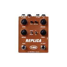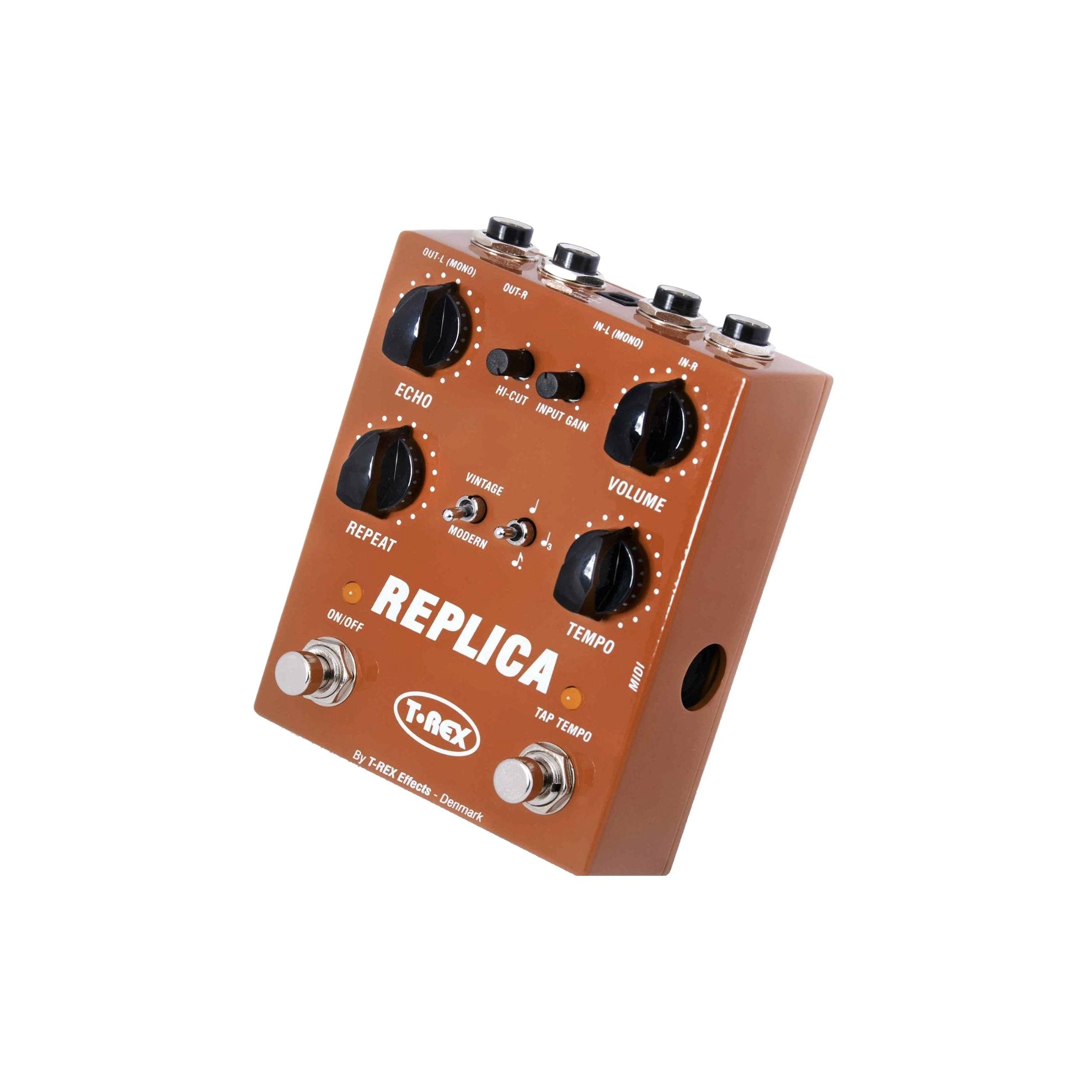 Replica är en effektpedal i stereo från danska T-Rex med delay och eko. Replica har kontroller för Echo, Repeat, Tempo, Volume, Hi-Cut, Input Gain, Vintage/Modern, On/Off och Tap Tempo.