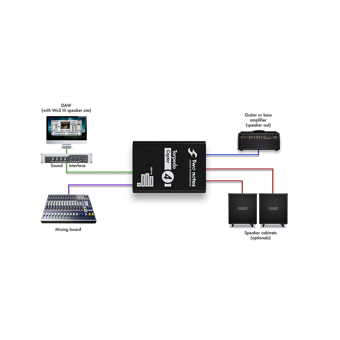 Med en noggrant avstämd reaktiv last på 16 ohm och stöd för förstärkare upp till 100 watt bevarar Torpedo Captor den naturliga responsen från rörförstärkare. Den analoga högtalarsimuleringen är baserad på Torpedos välrenommerade virtuella kabinett och ger ett färdigt, mixvänligt ljud direkt till ljudkort, mixer eller PA.