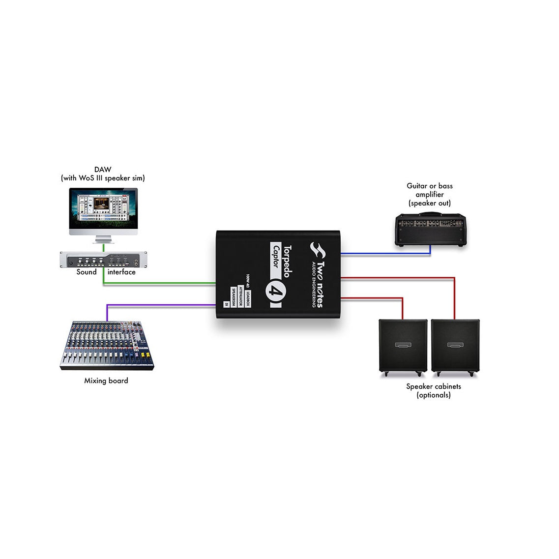 Med en noggrant avstämd reaktiv last på 4 ohm och stöd för förstärkare upp till 100 watt bevarar Torpedo Captor den naturliga dynamiken från rörförstärkare. Den analoga högtalarsimuleringen bygger på Torpedos välrenommerade virtuella kabinett och levererar ett färdigt, mixvänligt ljud direkt till ljudkort, mixer eller PA.