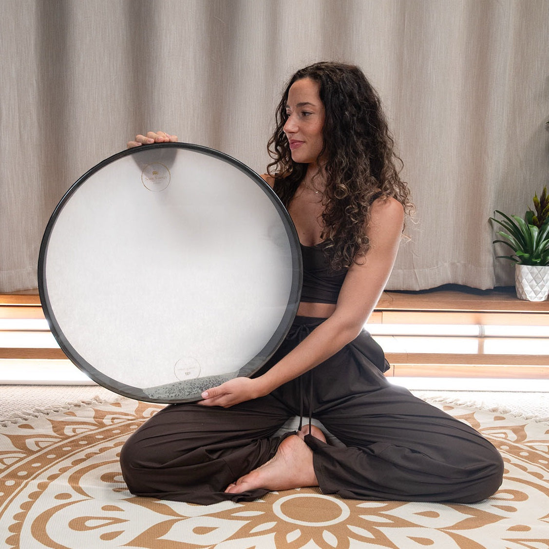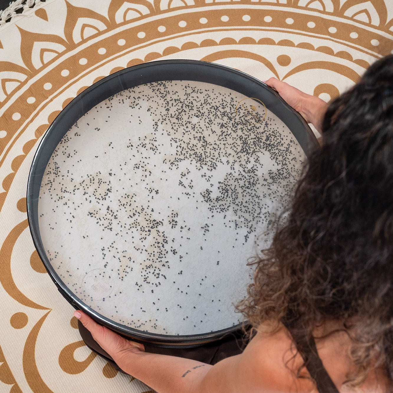 Genom att försiktigt luta trumman fram och tillbaka rör sig små pärlor inuti över skinnet och skapar mjuka, naturliga vågljud. Den större diametern ger ett djupare och mer omslutande ljudlandskap med längre sustain och tydlig rörelse i klangen.